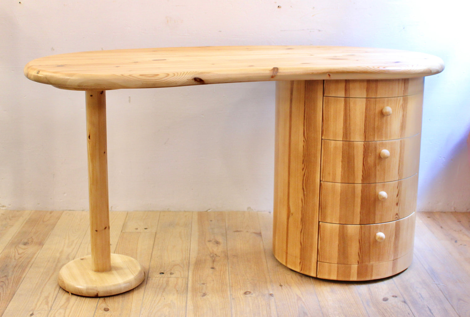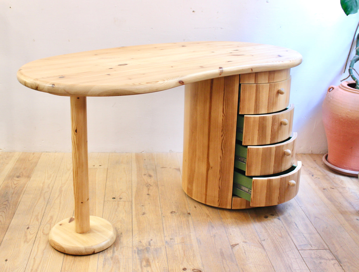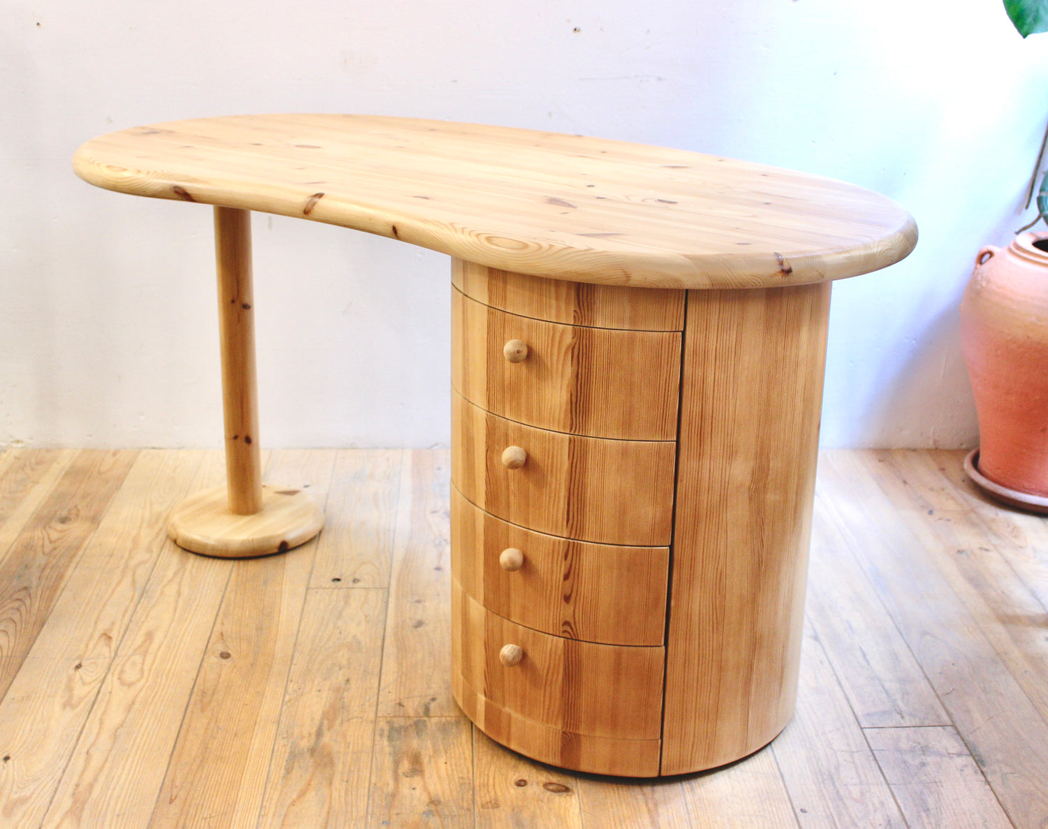 Escritorio en forma de riñón de la firma danesa C. F. Christensen, fundada en Silkeborg. Formas orgánicas y manufactura en pino, realizado en los años 70.