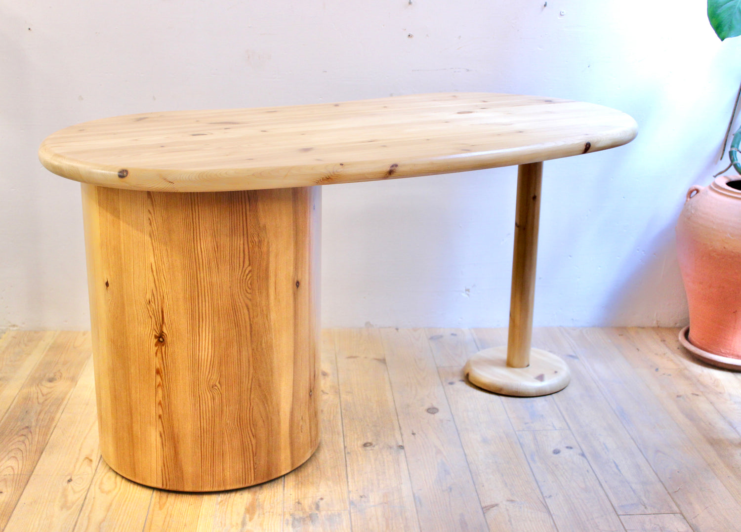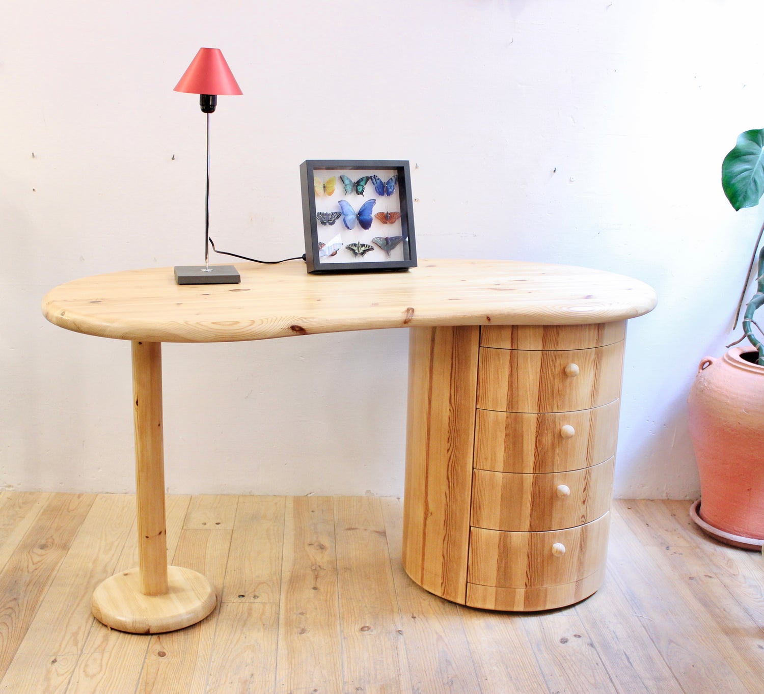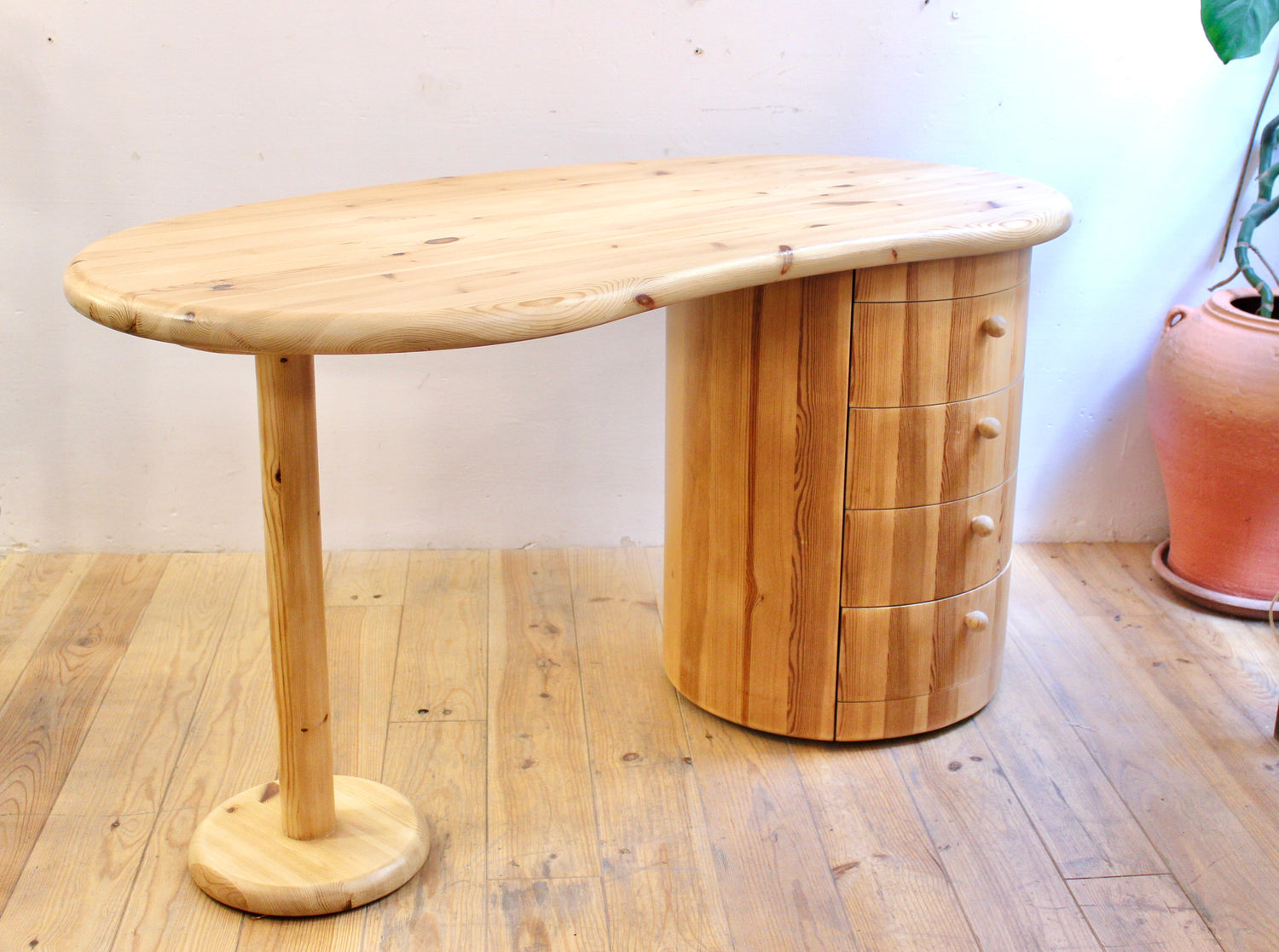Escritorio en forma de riñón de la firma danesa C. F. Christensen, fundada en Silkeborg. Formas orgánicas y manufactura en pino, realizado en los años 70.