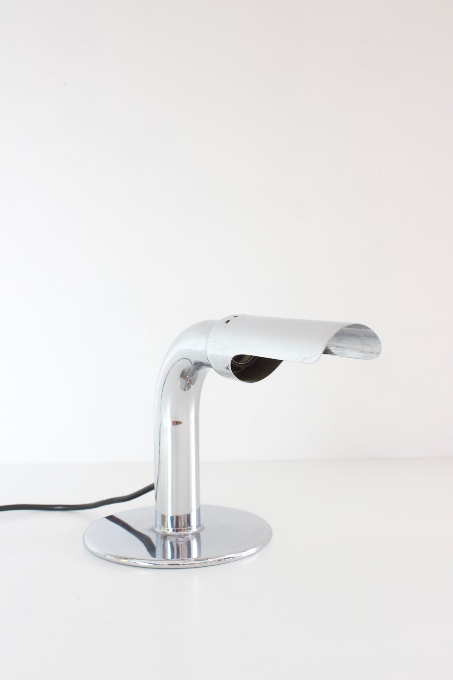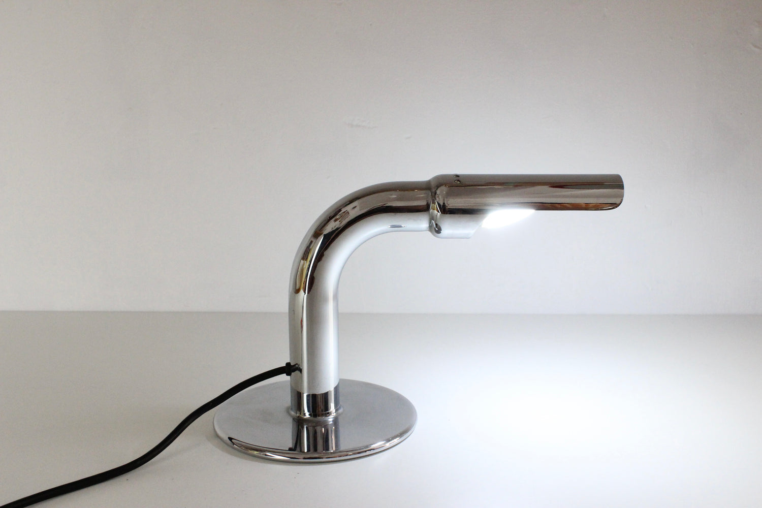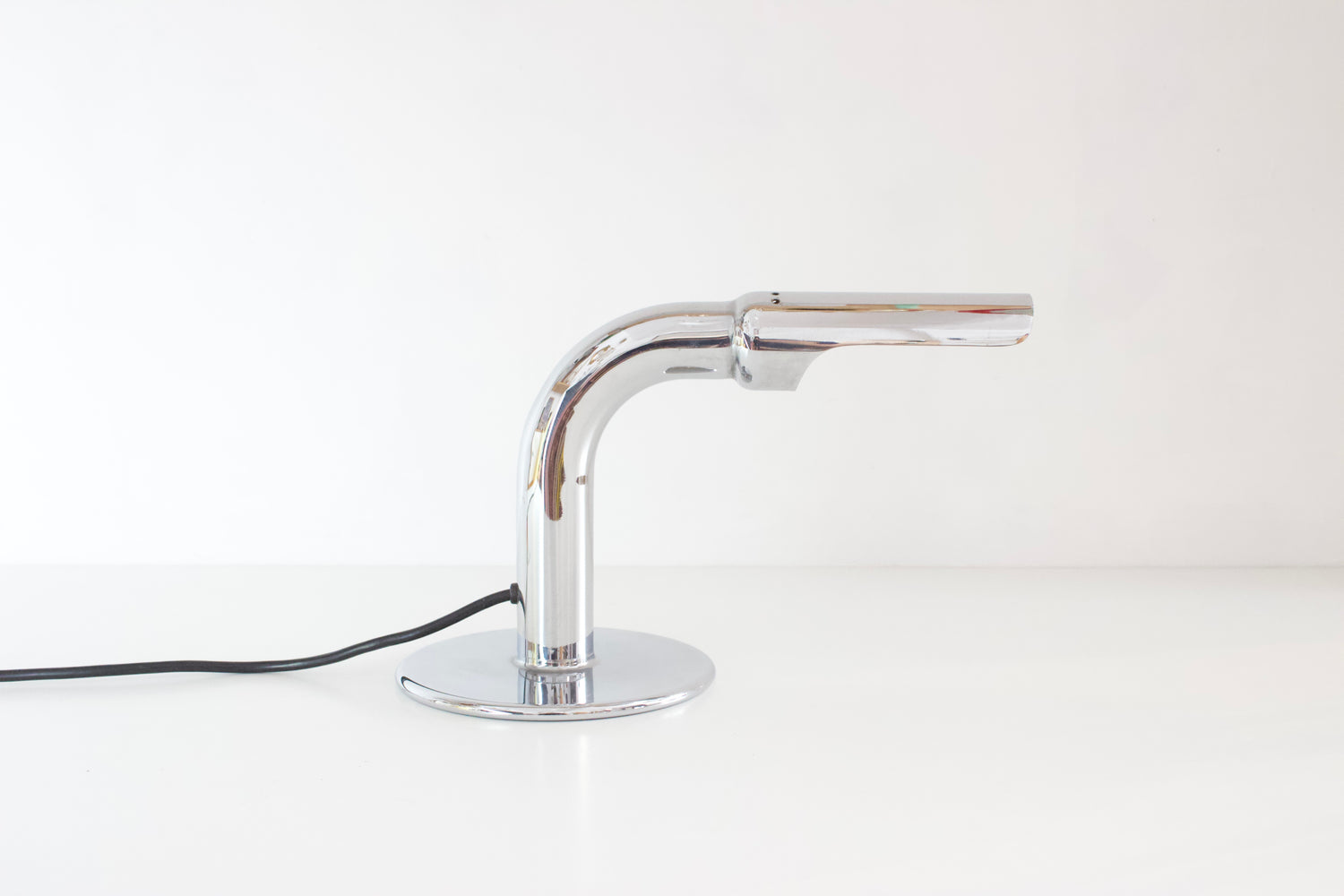 Lámpara de mesa GULP de Ingo Maurer para Design M en Alemania en el año 1969. Realizada en metal cromado, con señales del paso de tiempo acorde a su edad ( ver fotos).