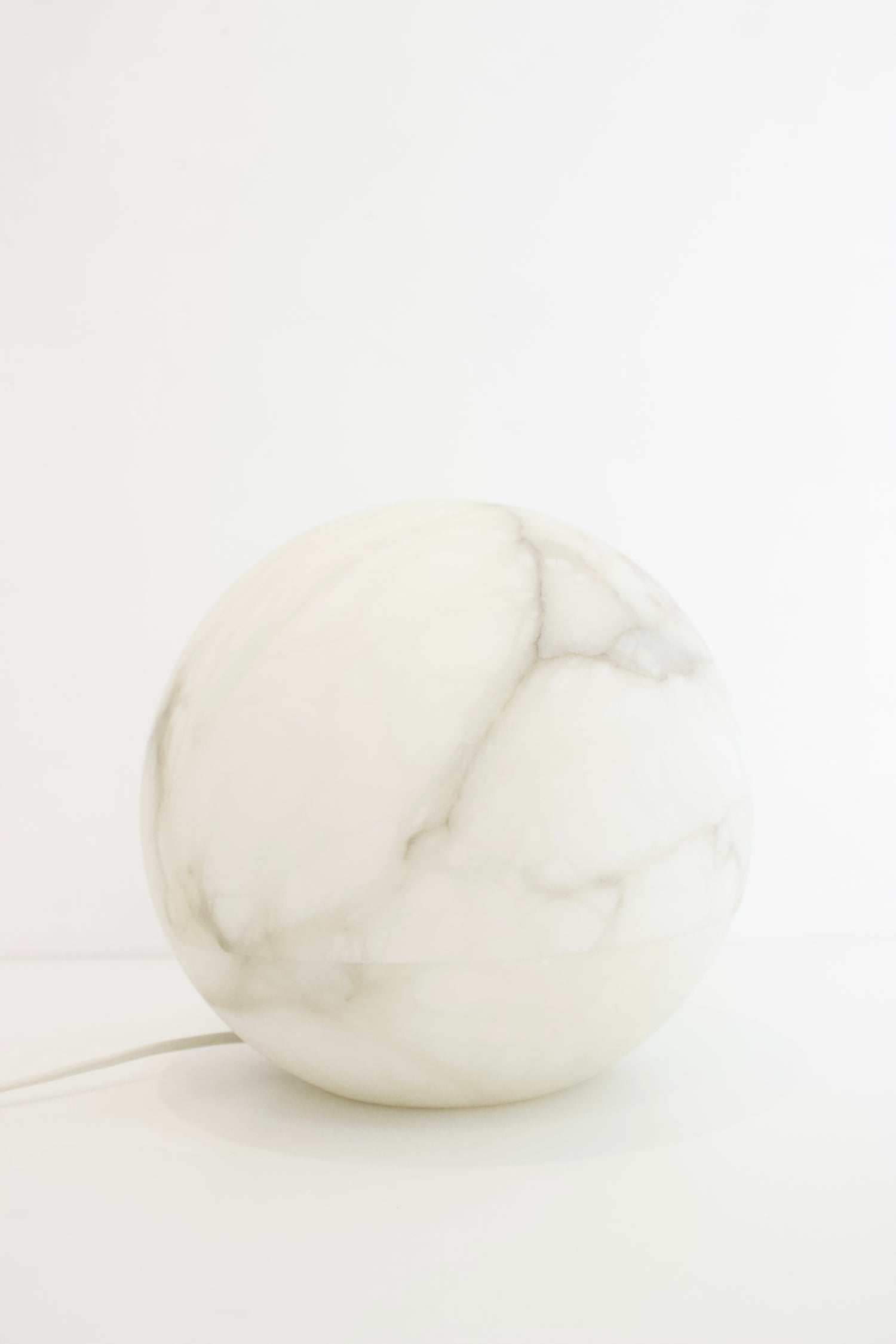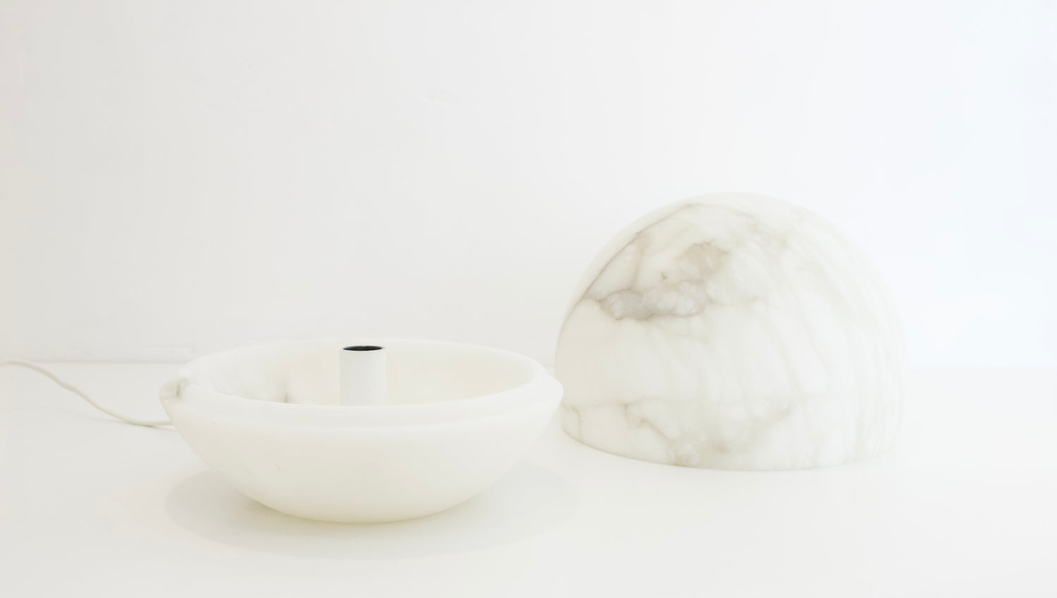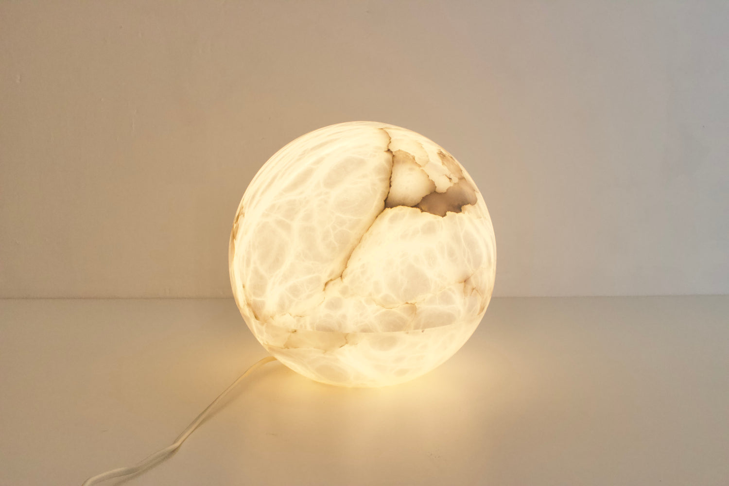 Se compone de dos piezas que forman una sola. Encendida, la luz pasa a través del alabastro dejando ver la veta de esta bonita piedra, aportando un ambiente cálido.