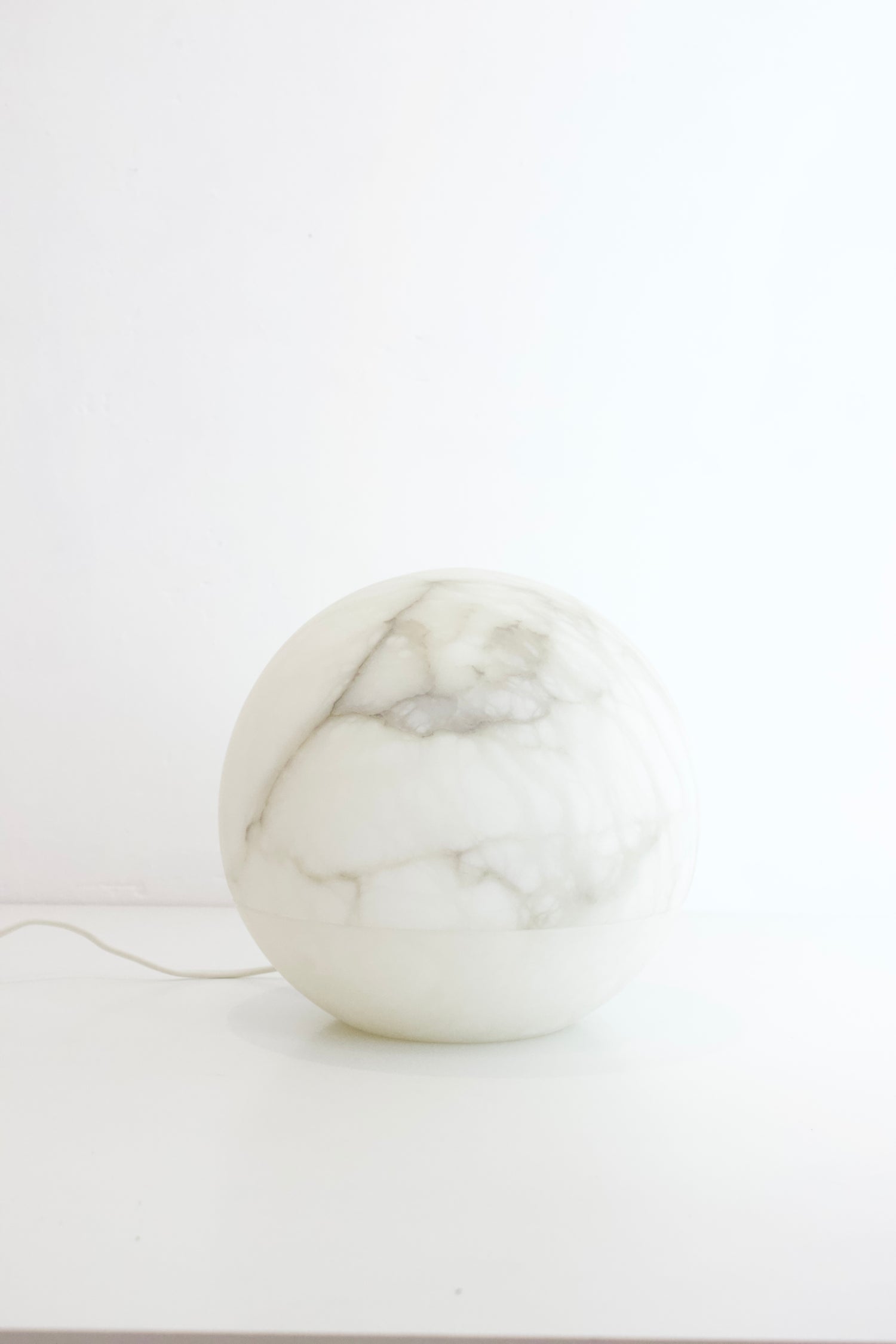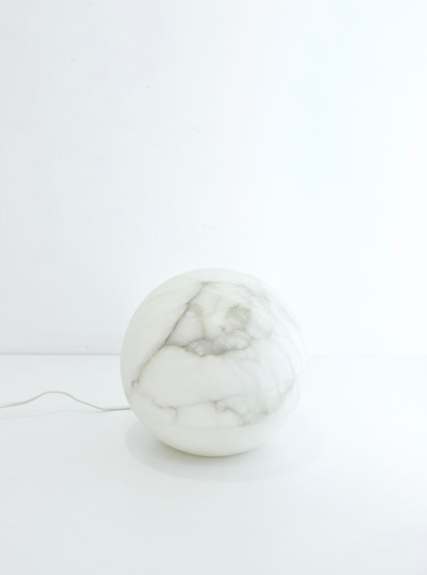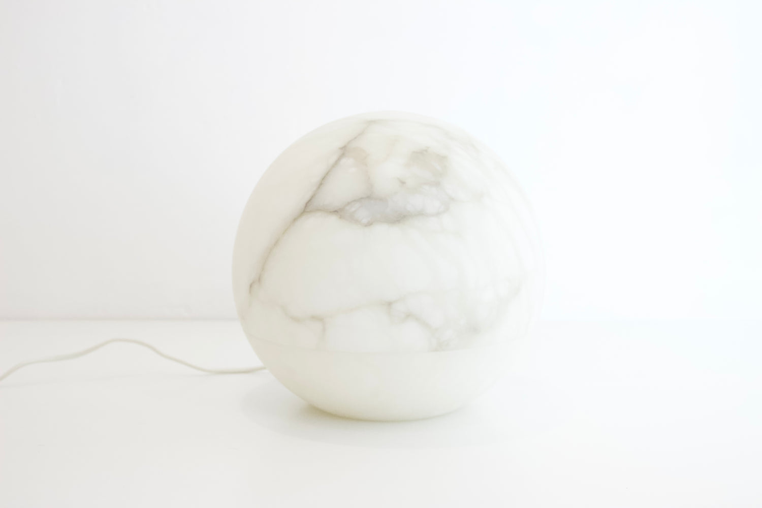 Se compone de dos piezas que forman una sola. Encendida, la luz pasa a través del alabastro dejando ver la veta de esta bonita piedra, aportando un ambiente cálido.