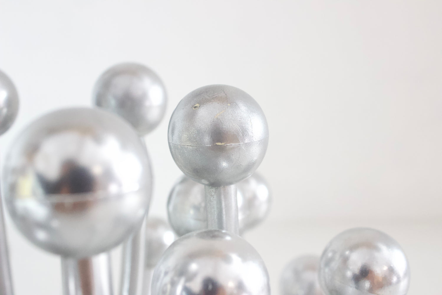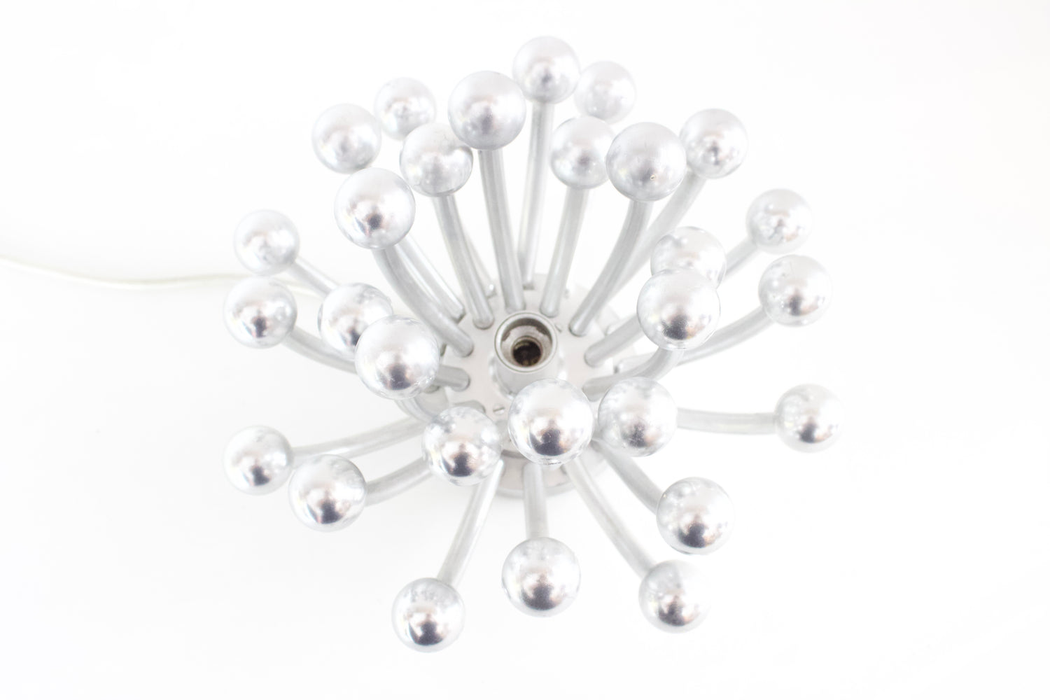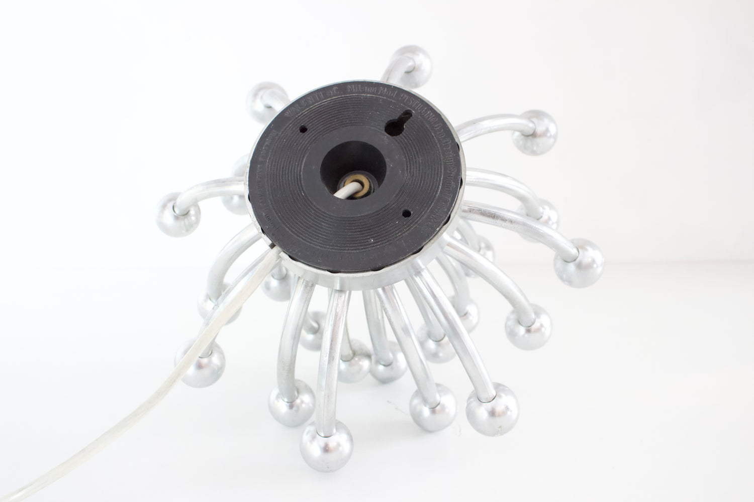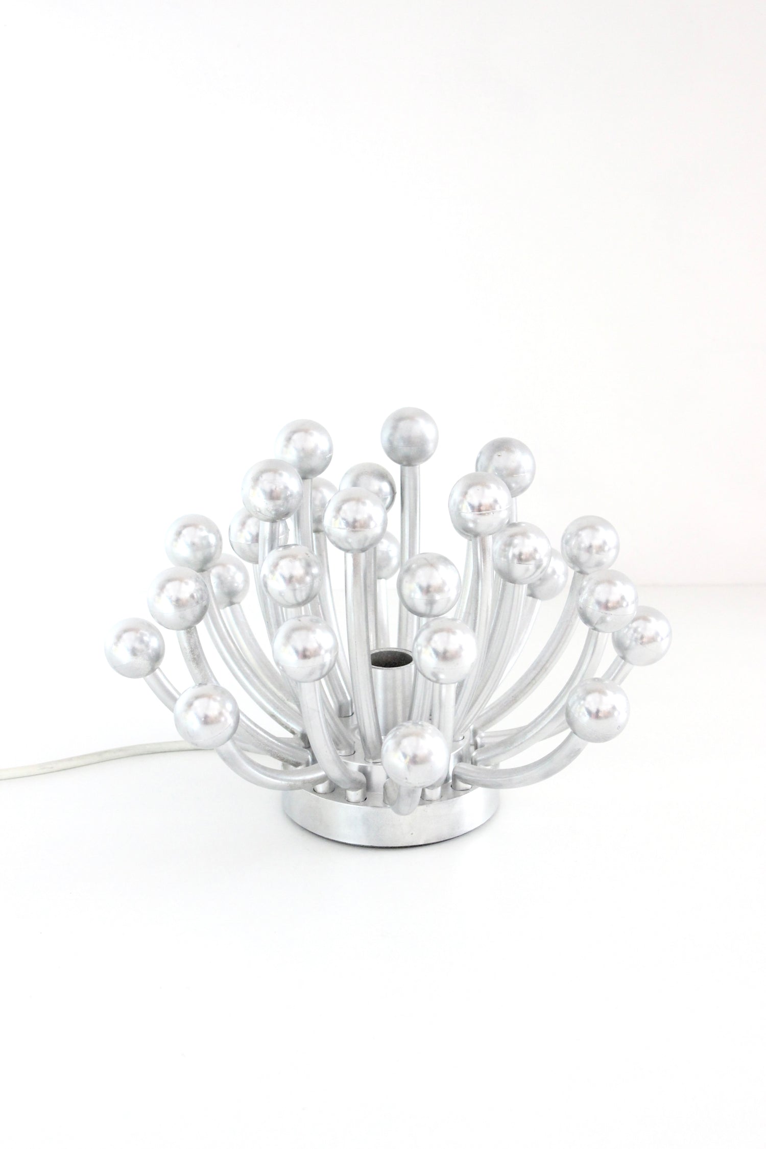 Lámpara de sobremesa o aplique de pared PISTILLINO , diseñada por Studio Tetrarch en 1972 para VALENTI. Realizada en plástico ABS con un acabado cromado en color plata, recrea la forma de un pistilo floral.