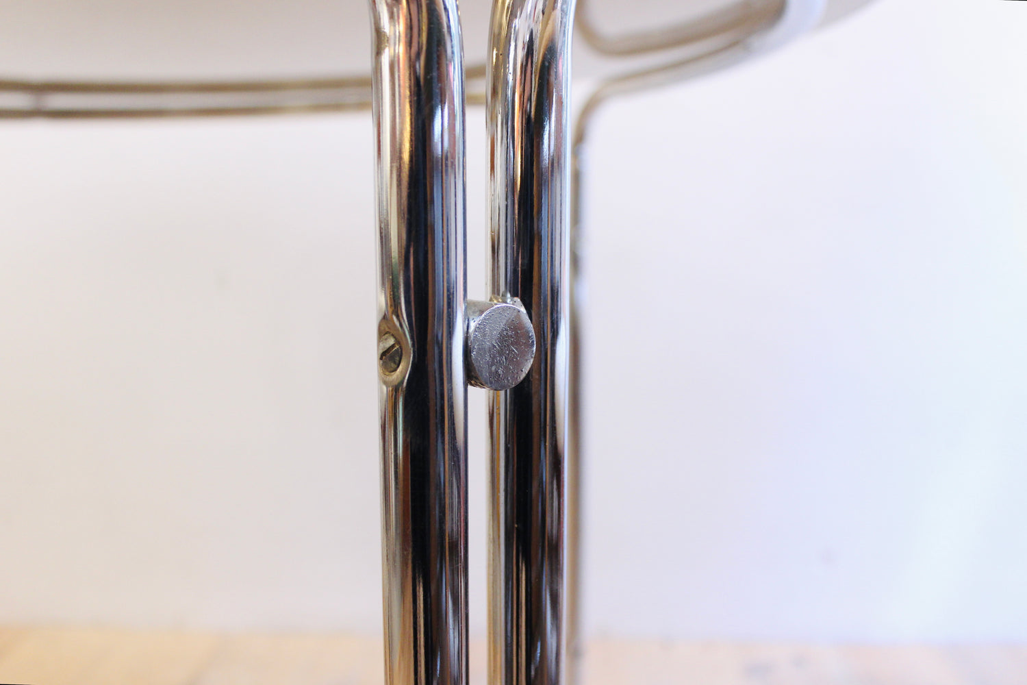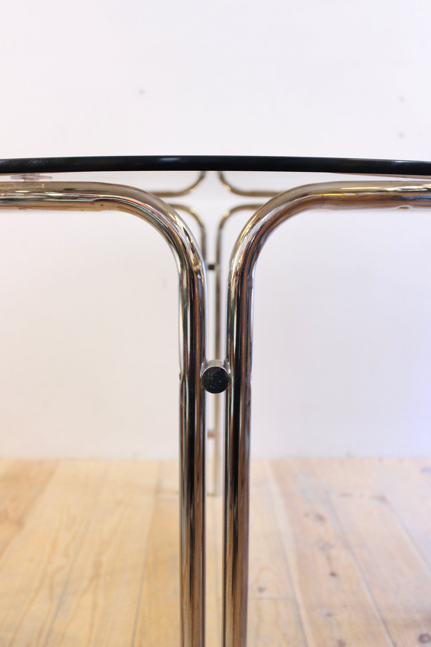 Preciosa mesa de los años 70 con un diseño muy similar a las atribuídas a Gastone Rinaldi. Base en metal cromado y sobre de cristal ahumado con algún signo del tiempo.